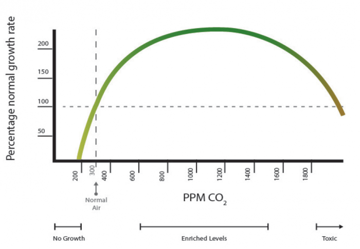 To διοξείδιο του άνθρακα αξιοποιείται κατά την διαδικασία της φωτοσύνθεσης για την δημιουργία υδατανθράκων οι οποίοι αποδομούνται κατά την αναπνοή και συμβάλλουν στην ανάπτυξη του φυτού. Η συγκέντρωση του στον αέρα είναι 400ppm, ενώ η αύξησή του σε ένα κλειστό χώρο καλλιέργειας δίνει ορατά αποτελέσματα στην αύξηση της παραγωγής εφόσον τα φυτά που καλλιεργούνται είναι C3 φυτά, με ανώτατο όριο περίπου τα 1800ppm ενώ περαιτέρω αύξηση δημιουργεί ζημιά στα φυτά.