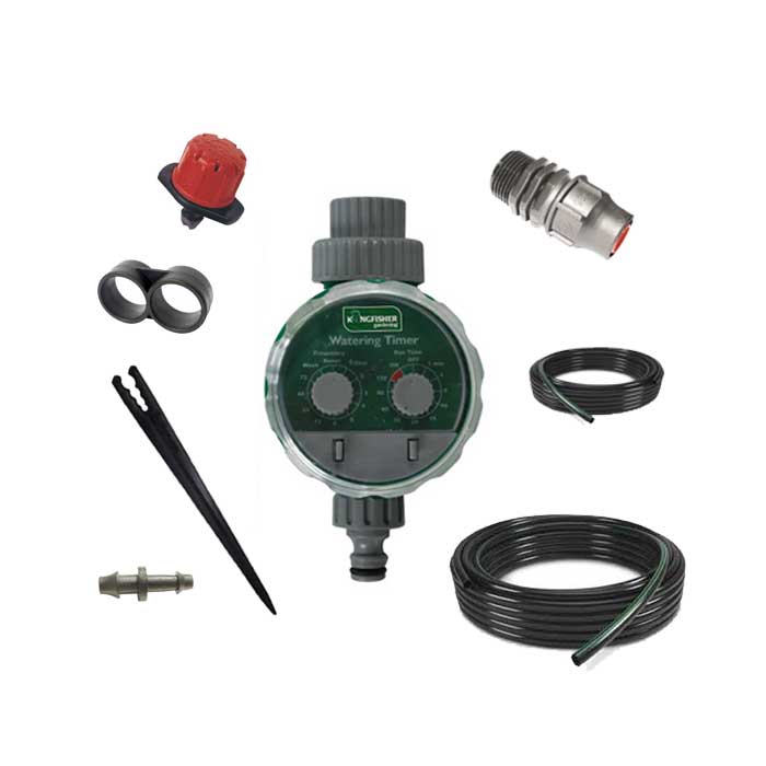Πλήρες σετ αυτόματου ποτίσματος. Έχει δυνατότητα να ποτίζει εώς και 10 γλάστρες. Ιδανικό για αυλές, μπαλκόνια και μικρούς κήπους