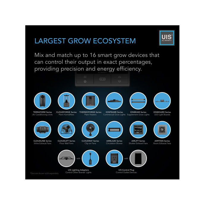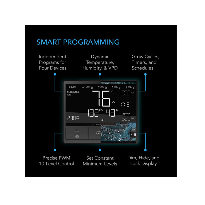 Acting as the central hub of the AC Infinity UIS™ ecosystem, it allows you to connect and independently program up to four different devices.