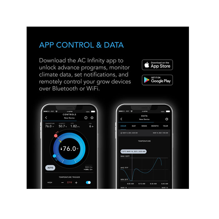 - Through Bluetooth or WiFi, the AC Infinity app allows remote control, notifications, alarms, historical climate charts, and CSV data export.