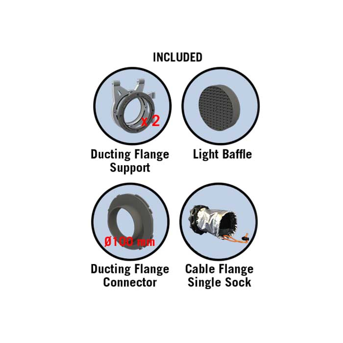 | Ducting Flange | 2x Support Ø160mm 1x Connector Ø100mm 1x Light Baffle Video : https://youtu.be/DBKqdZAMPUc |