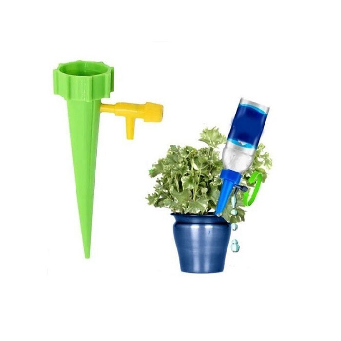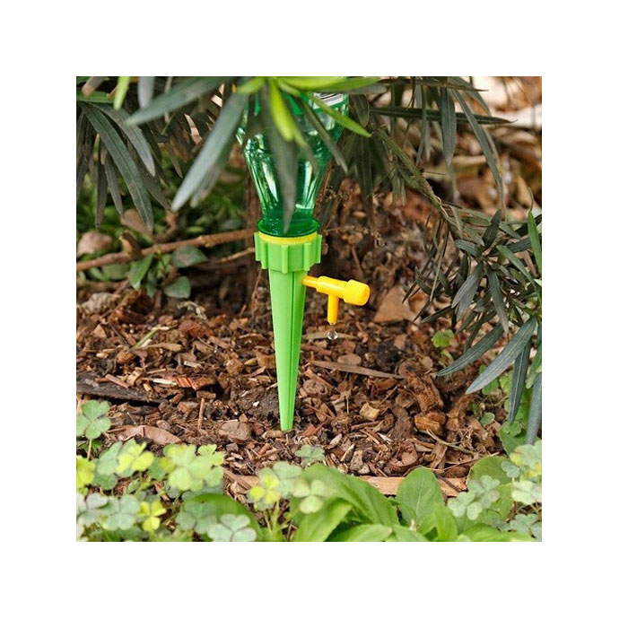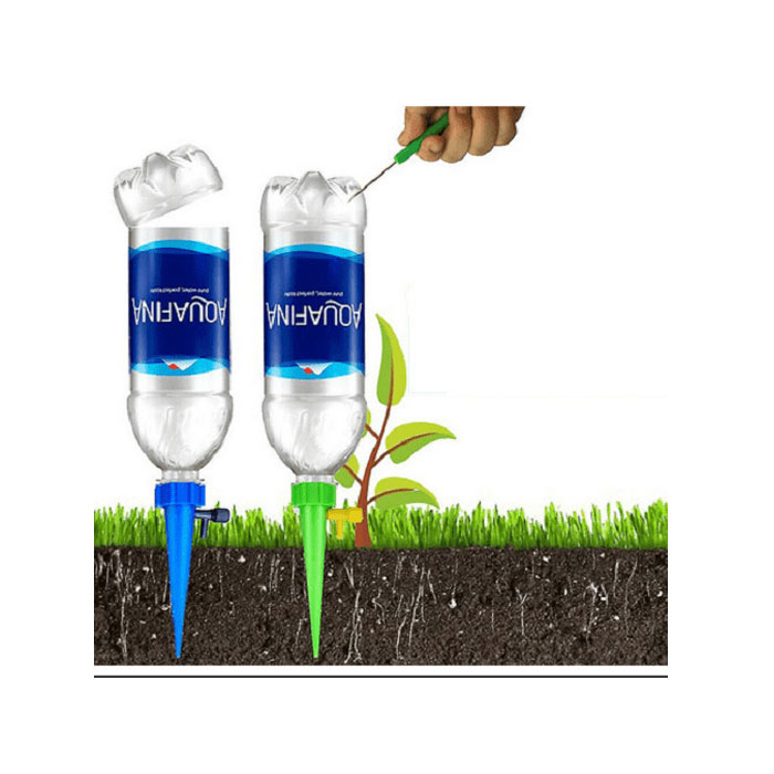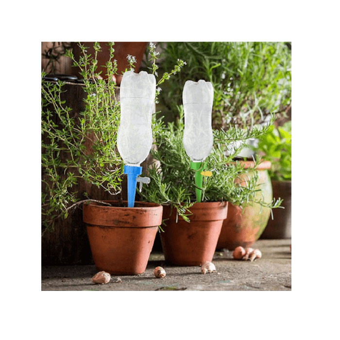 Drop to Drop Watering system. Just screw it in any plastic bottle and turn it upside down inside the pot.