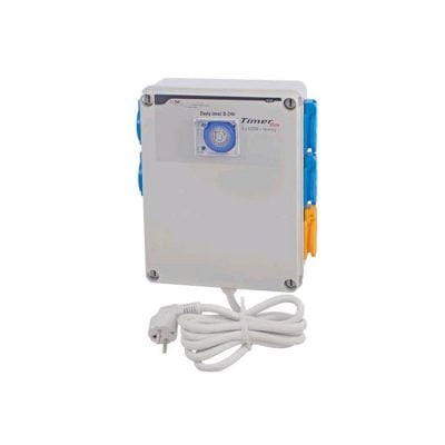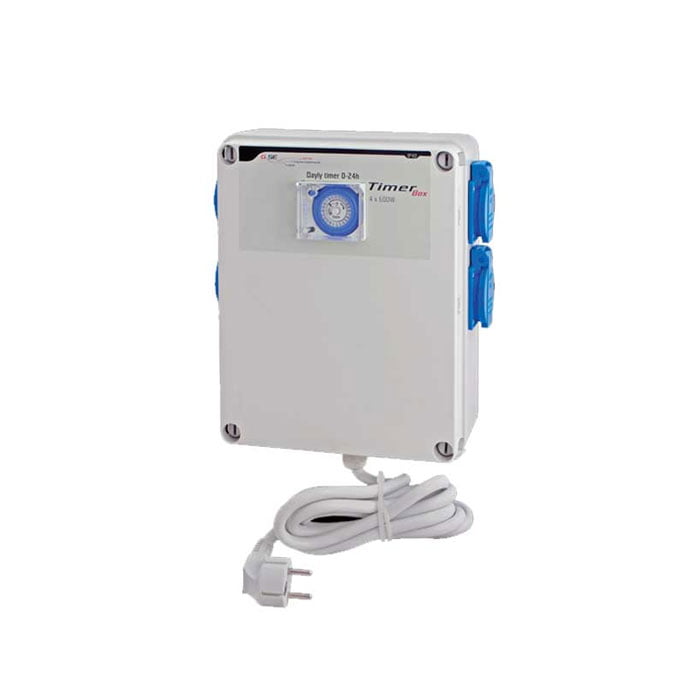The timer box II by G-Systems is used by several inductive loads such as high-pressure lamps with high switch on and off simultaneously. This turns on Contactor/Relay 4x600W loads. Model with heating socket is on when lights are off (power management).