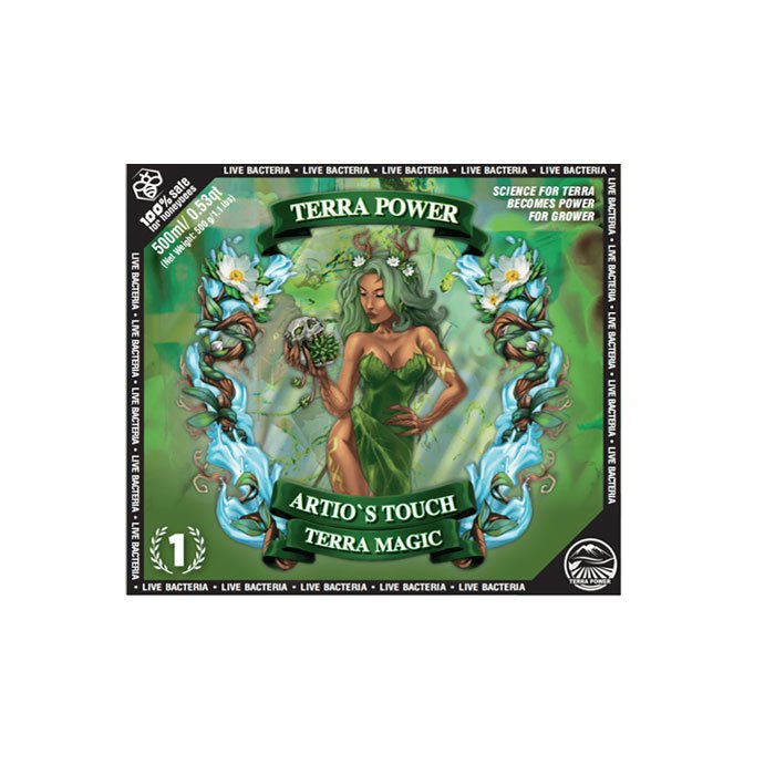 ARTIO`S TOUCH – TERRA MAGIC is a liquid microbial fertilizer for fast and rigorous growth, especially developed for use in all types of nutrition and plant protection programmes for medical plants. The strains included in the composition synthesize phytohormones and vitamins. These beneficial bacteria are capable of solubilizing inorganic phosphorus from insoluble compounds and support the nitrogen feeding of crops by bringing atmospheric and organic nitrogen into a form that can be assimilated by plants. It can be applied alone or as a supplement to nutrient or other solutions for foliar, root (soil or hydroponic) treatment, as well as for treatment of seeds, bulbs and seedlings.