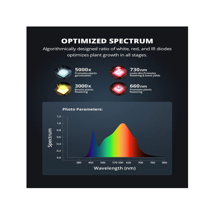 Perfect colour rendering and a perfectly balanced colour spectrum that mimics the plants natural sunlight (Sun-like) including warm white (3000 K), white (6500 K), dark red (660 nm) and infrared (730 nm) light.